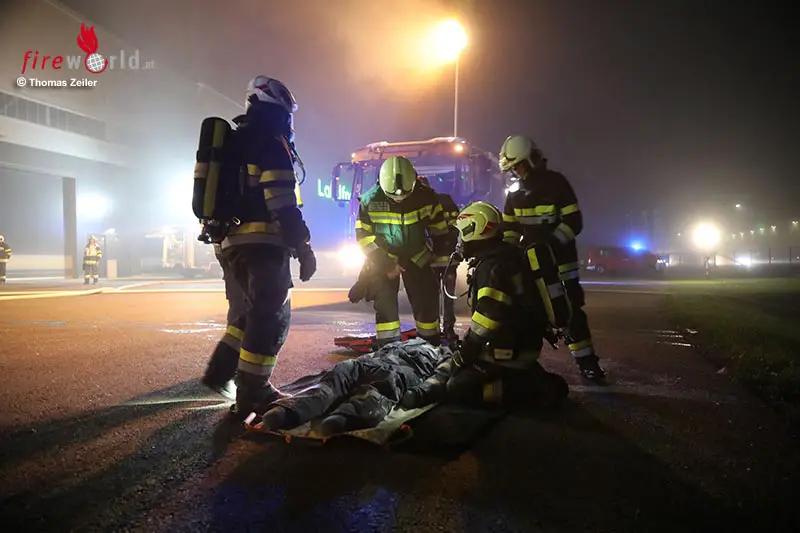 Mittels des schweren Atemschutzes konnten die vermisste Person aus den Hallen binnen weniger Minuten durch die einzelnen Atemschutztrupps gerettet werden. Zusätzlich wurde noch die Wasserversorgung für die Wasserwerfer C und HD Rohre durch eine Zubringleitung sichergestellt.