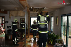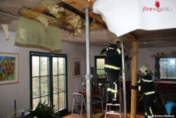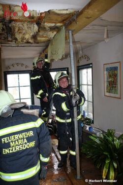 An der Einsatzstelle angekommen, stellte Einsatzleiter BI Girts Hartmanis fest, dass die Deckenkonstruktion, im Wohnzimmer, eines Ferienhauses eingestürzt ist und Wasser vom 1. Stock hinunterläuft. Nach Abschaltung des Wasserhaupthahns wurde mit vier Pölzrohren begonnen, die Decke gegen weiteres Einstürzen zu pölzen. Gleichzeitig wurde mit einer Motorkettensäge entsprechendes Pölzholz auf die richtige Länge geschnitten.