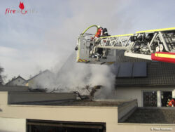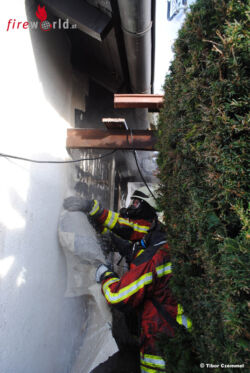 Unter Atemschutz wurde mit 2 C-Rohren das Feuer eingedämmt und ein Übergreifen auf das Hausdach verhindert. Der erste Angriffstrupp musste sich durch einen schmalen Durchgang erst einen Weg am Feuer vorbei kämpfen, um gezielt von der Terrasse aus den Brand zu löschen. Währenddessen kühlte der zweite Trupp das Dach und die Fassade um eine Ausbreitung zu unterbinden. Über die Drehleiter wurde das Dach mit der Wärmebildkamera kontrolliert. An der Fassade, direkt neben dem Brand, war die komplette Dämmung geschmolzen und der Putz mit dem Armierungsgewebe musste von Hand entfernt werden. Auch hier wurde mit der Wärmebildkamera kontrolliert und heißes Dämmmaterial entfernt.