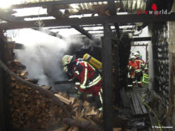 Da mehrere m³ gespaltenes Holz für den Holzofen auf der Terrasse waren und ein Großteil davon vom Brand entzündet war, musste dieses von Hand unter Atemschutz abgetragen werden. So kam man an die tiefer gelegenen Glutnester, wohin sich das Feuer schon seinen Weg gebrannt hatte. Zwei Personen aus dem Nachbarhaus wurden beim Verlassen des Hauses von der Rauchwolke überrascht und atmeten Rauchgase ein. Nach anfänglich keinen Beschwerden, wurden diese schlimmer und die Personen wurden dann an den Rettungsdienst übergeben. Dieser war unter dem Organisatorischen Leiter Matthias Wahl und dem Leitenden Notarzt Dr. Richard Spörri mit einem Rettungswagen des Rettungsdiensts, einem Rettungswagen des Malteser Hilfsdienst und der Notfallhilfe Bruchsal vor Ort. Die beiden Personen wurden zur weiteren Behandlung in ein Krankenhaus verbracht.