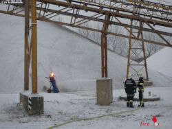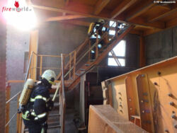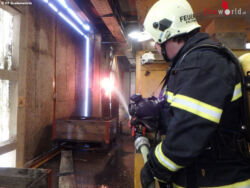 Bereits kurz später rückte die FF Grafenwörth mit allen vier Einsatzfahrzeugen ins Gewerbegebiet aus. Im 3. Stock einer Industrieanlage war die Acetylengasflasche eines Schweißgeräts im Bereich des Druckminderers in Brand geraten. Durch die Hitzeentwicklung hatten sich bereits Sekundärbrände auf die umliegenden Strukturen ausgebreitet. Unterstützt von den Feuerwehren Jettsdorf und Feuersbrunn ging ein Atemschutztrupp des FF Grafenwörth mit einer Schlauchleitung zur Erkundung in das Objekt.