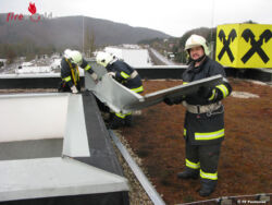Beim neu errichteten Gartenstadtzentrum direkt neben dem Feuerwehrhaus Puchenau hatte sich durch die starken Sturmböen der letzten Nacht die Blechabdeckung der Attika vom Dach gelöst und hing an der Hauswand herab. Da das Blech auf den darunterliegenden Balkon abzustürzen drohte, alarmierte der Mieter die Feuerwehr Puchenau. Diese rückte umgehend unter Einsatzleiter Michael Hehenberger mit dem Tanklösch- und dem Kommandofahrzeug zur Einsatzstelle aus.