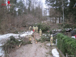 Zahlreiche umgestürzte Bäume blockierten die Straße. Mit zwei Motorsägen und der Einbauseilwinde wurde der Weg wieder freigemacht. Das angrenzende Haus wurde zum Glück nur leicht beschädigt und keine Personen dadurch gefährdet.