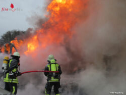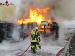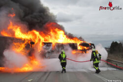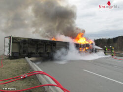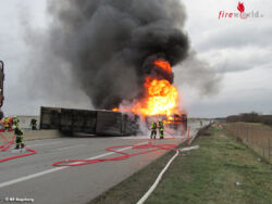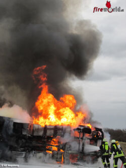 Beim Eintreffen der Berufsfeuerwehr Augsburg brannte der quer zur Fahrbahn liegende Sattelzug in voller Ausdehnung. Dabei wurde ein Pkw (auch bereits in Vollbrand) unter dem brennenden Sattelzug regelrecht begraben. Der Lkw-Fahrer sowie auch die Pkw-Fahrerin konnten von Ersthelfern bzw. wie durch ein Wunder sich selbst befreien und wurden mit dem Hubschrauber/ Rettungsdienst schwerverletzt ins Krankenhaus gebracht bzw. in eine Spezialklinik für Brandverletzungen nach München geflogen.
