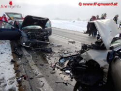 Zwei scherverletzte Fahrzeuginsassen wurden von den Einsatzkräften des Roten Kreuzes und von Feuerwehrsanitätern und Feuerwehrärzten erstversorgt und danach mit einem weiteren Leichtverletzten mit mehreren Rettungsfahrzeugen in das Landesklinikum Gmünd zur weiteren medizinischen Abklärung gebracht. Nach dem Abtransport der Verletzten konnte die Mannschaft der Feuerwehr der Stadt Gmünd wieder in die Zentrale einrücken. Die Aufräumungsarbeiten führten die Feuerwehren Langschwarza und Schrems durch.