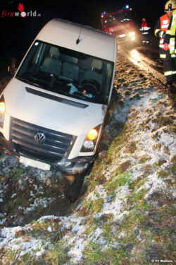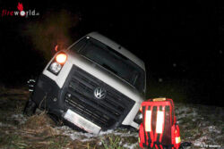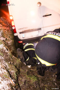 Am Einsatzort stellte sich heraus, dass der Lenker des Kleinbusses von der Fahrbahn abgekommen war und im Straßengraben hängen blieb. Die Fahrzeuginsassen konnten sich eigenständig befreien und blieben unverletzt. Nach einer Abstimmung mit der Polizei und dem Fahrzeuglenker wurde die FF Wallern der Auftrag zur Fahrzeugbergung erteilt, um das Fahrzeug an den Abschleppdienst übergeben zu können. Mit Hilfe der Fahrzeug-Seilwinde und entsprechender "Men-Power" konnte das Fahrzeug aus dem Graben geborgen werden. Während der Bergungsarbeiten musste teilweise die Innviertler Bundesstraße 134 gesperrt werden.