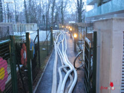 Durch einen Großeinsatz der Berufsfeuerwehr mit acht Pumpen, hunderten Meter Schlauchleitungen und einem Notstromaggregat werden pro Minute rund 20.000 Liter Wasser abgepumpt.