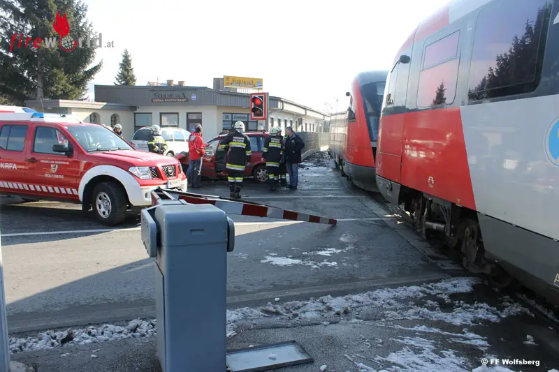 Ein Fahrzeuglenker fuhr mit seinem Fahrzeug aus unbekannter Ursache trotz geschlossener Schrankenanlage in den Bahnübergang in der Klagenfurter Straße ein und wurde von der Lok des herannahenden Personenzuges frontal erfasst. Wie durch ein Wunder konnte der Fahrzeuglenker nach dem Zusammenstoß sein Fahrzeug noch selbstständig verlassen und wurde nach der Erstversorgung vom Roten Kreuz ins Krankenhaus Wolfsberg eingeliefert. Das Unfallfahrzeug wurde anschließend von der Feuerwehr Wolfsberg geborgen und die ausgelaufenen Betriebsmittel gebunden. Nach dem Abschluss der Arbeiten konnten die Einsatzkräfte nach ca. einer Stunde wieder ins Rüsthaus einrücken.