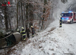 Um 11.15 Uhr wurde die FF Eichberg daher telefonisch zu einer weiteren Fahrzeugbergung am Haselgrundweg alarmiert. Ein Fahrzeug ist von der schneeglatten Fahrbahn abgekommen und im Straßengraben gelandet.