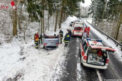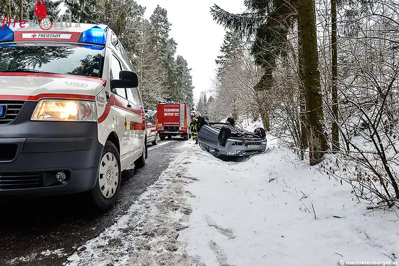 Im Ortschaftsbereich Steinböckhof kam sie auf der mit Schneematsch bedeckten Fahrbahn ins Schleudern, von der Fahrbahn ab, prallte gegen die Straßenböschung, wobei sich der PKW überschlug und kam schließlich am Dach liegend zum Stillstand.
