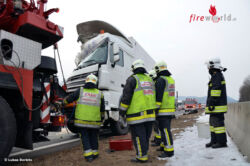 Besonders die Versorgung der defekten Druckluftbremsanlage gestaltete sich dabei äußerst kompliziert und zeitaufwendig. Im Anschluss daran konnte der Lkw mit Hilfe des Kranfahrzeuges am Pannenstreifen bis zur nächsten Betriebsabfahrt geschleppt werden. Der verunfallte Tankwagen wurde ebenfalls durch die Feuerwehr bis zur Betriebsabfahrt begleitet. Nach etwas mehr als drei Stunden konnte der Einsatz für die 15 Feuerwehrmitglieder und fünf ausgerückten Fahrzeuge beendet werden.