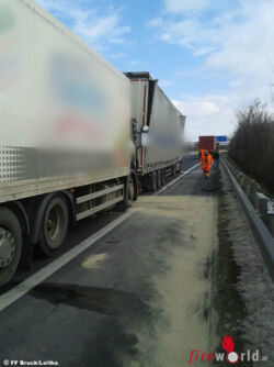 Beim Eintreffen wurde folgendes festgestellt: Verkehrsunfall mit insgesamt fünf beteiligten Lkw bzw. Sattelkraftfahrzeugen. Ein Lkw auf einem Sattelkraftfahrzeug aufgefahren, der Fahrer eingeschlossen aber nicht eingeklemmt, der Lenker des Sattelkraftfahrzeuges verletzt (wird bereits von RK-Sanitätern versorgt), Betriebsmittel fließen aus.