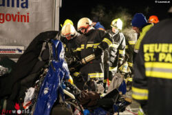 Der Pkw wurde dabei völlig zerstört. Die Insassen wurden eingeklemmt und konnten nur mehr von der Feuerwehr aus dem Wrack befreit werden. Beide mussten vom Notarzt versorgt und wegen ihrer schweren Verletzungen in die Krankenhäuser Kirchdorf und Wels gebracht werden.
