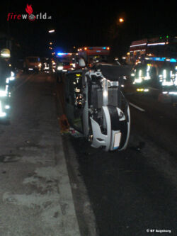 Beim Eintreffender Feuerwehr lag nach einem Verkehrsunfall ein Pkw auf der Fahrzeugseite. Insgesamt wurden drei Personen vom Notarzt/Rettungsdienst behandelt und ins Krankenhaus gebracht. Es kam zu Verkehrsbeeinträchtigungen auf der Landsberger Straße.