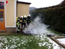 Nach knapp drei Stunden stand die Tonne in Vollbrand. Geistesgegenwärtig alarmierte die Frau die Feuerwehr. Danach führte sie die ersten Löschversuche mit einem Pulverlöscher durch wobei der Brand stark eingedämmt wurde. Als die Feuerwehr nach rund fünf Minuten eintraf war die Tonne bereits stark verbrannt. Ein Atemschutztrupp der FF Weistrach führte lediglich Nachlöscharbeiten mit dem Hochdruckrohr durch. Da sich das Schadensausmaß beschränkte konnten die Kräfte der FF St.Peter/Au mit 2 Fahrzeugen wieder einrücken.