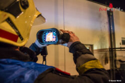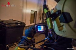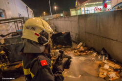 Schon während der Anfahrt des Tanklöschfahrzeuges begann ein Trupp mit dem Anlegen der umluftunabhängigen Atemschutzgeräte. An der Einsatzstelle angekommen schlugen die Flammen bereits aus der Mülltonne, der Atemschutztrupp begann sofort mit der Brandbekämpfung und nahm ein Rohr vor. Kurze Zeit später waren die Flammen niedergeschlagen und der Mistkübel wurde von der Fassade des angrenzenden Gebäudes weggezogen. Daraufhin wurde die zum Teil zerschmolzene Tonne ausgeräumt um auch an die letzten Glutnester zu gelangen. Mit einer Wärmebildkamera und einem Hochdruckrohr wurden noch Nachlöscharbeiten durchgeführt.