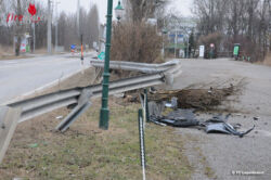 Ein Pkw fuhr geradeaus über die Kreuzung und krachte mit voller Wucht gegen die Leitplanke. Durch die Wucht der Kollision wurde das Fahrzeug stark beschädigt und mehrere Verkehrs- und Hinweisschilder, sowie die Leitplanke stark in Mitleidenschaft gezogen. Das Fahrzeug ist nach dem Unfall im Trennstreifen Parkplatz Golfplatz und Achauer Straße zum Stillstand gekommen.
