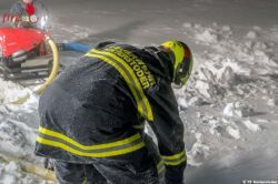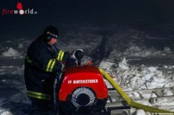 Der starke Nebel und Temperaturen um – 12 Grad Celsius erleichterten die Arbeiten keinesfalls. Zur Errichtung der Wasserentnahmestelle musste das Eis am Speichersee mit der Motorsäge aufgeschnitten werden. Parallel dazu wurde die Beleuchtung sowie die Schlauchleitung errichtet.