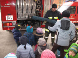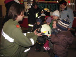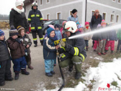Die Kinder, die von den Pädagoginnen schon viel über die Feuerwehr gehört hatten, konnten das Feuerwehrhaus und die Fahrzeuge und Geräte der Feuerwehr besichtigen und ausprobieren. Auch die "Verwandlung" eines ganz normalen Menschen zum Feuerwehrmann mit voller Ausrüstung und Atemschutzgerät konnte miterlebt werden. Die Ausrüstung durfte natürlich dann auch selbst anprobiert werden. Nach einer Fahrt mit den Feuerwehrfahrzeugen zum Kindergarten durften die Kinder noch wie ein richtiger Feuerwehrmann mit dem Strahlrohr spritzen.