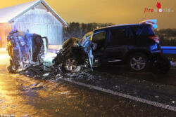 Durch den heftigen Zusammenprall wurde am Verursacherfahrzeug ein Rad abgerissen. Dieses flog durch die Luft und prallte in ein nachfolgendes Auto, dessen Lenkerin unverletzt blieb. Der 27-jährige Unfallverursacher wurde durch den Unfall leicht verletzt. Der 65-jährige Fahrzeuglenker im korrekt entgegen kommenden Fahrzeug wurde schwer verletzt. Beide Personen wurden mit dem Rettungswagen ins Spital eingeliefert. Zur Absicherung der Unfallstelle wurde die Feuerwehr aufgeboten. An beiden Fahrzeugen entstand Totalschaden.