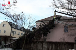 Ein Baum in einem privaten Garten an der Wilhelmstraße wurde durch den starken Wind teilweise entwurzelt und ist auf ein benachbartes Haus gestürzt. Die Einsatzkräfte konnten vom Rettungskorb der Drehleiter aus den Nadelbaum am Ladekran des Wechselladefahrzeuges anschlagen und sichern. Danach wurde der Stamm vom Boden aus in mehrere Teile abgelängt. Anschließend konnte die Baumkrone kontrolliert mit dem Kran abgelegt werden. Die Einsatzkräfte der Stadtfeuerwehr sind bereits um 14:00 Uhr wieder eingerückt.