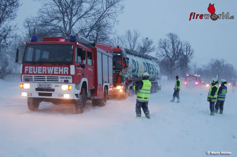 Auf dem stark schneeverwehten Straßenabschnitt mussten zwei weitere von der Fahrbahn abgekommene Fahrzeuge geborgen werden. Ein Pkw wurde mittels Lastkette von TLF-A2000 wieder auf die Fahrbahn gezogen, der zweite händisch auf die Fahrbahn geschoben und beide konnten die Weiterfahrt fortsetzen. Die Feuerwehr Laxenburg stand mit drei Fahrzeugen und 19 Mitgliedern 50 Minuten im Einsatz.