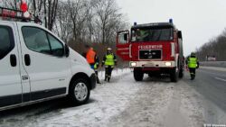 Drei Mitarbeiter einer Serviceleistungsfirma kamen mit ihrem Firmenbus auf der winterlichen Fahrbahn ins Schleudern und touchierten dabei die Betonmittelleitschiene. Danach rutschte der Kleinbus über alle Spuren mit dem Heck voran in den Straßengraben. Die Insassen blieben dabei zum Glück unverletzt.
