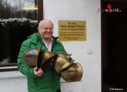 BAYERN (DEUTSCHLAND): Am Montag, 9. Februar 2015, spendete der Augsburger Arzt Dr. Fritsch der Feuerwehrerlebniswelt Bayern fünf edle Feuerwehr Messinghelme.