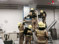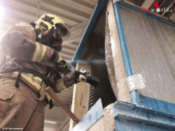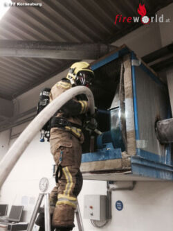 Da daher ein bestätigtes Brandereignis vorlag, wurde um 3:38 Uhr auf „Brand-Alarmstufe 2“ erhöht, um weitere Mannschaft zur Verfügung zu haben. Im Bereich einer Absauganlage und des dort befindlichen Ventilators war es zu einem Feuer gekommen. Abgesaugte und gestaute Papierschnitzel hatten sich entzündet. Der Brand wurde mittels mehrerer Handfeuerlöscher und einem C-Rohr unter schwerem Atemschutz rasch bekämpft. Die Absauganlage musste gewaltsam geöffnet werden, um verbliebene Glutnester abzulöschen. Eine Kontrolle mittels Wärmebildkamera wurde durchgeführt. „Brand Aus“ konnte um 4:23 Uhr gegeben werden. Ein Mitarbeiter musste mit Verdacht auf Rauchgasvergiftung dem Roten Kreuz übergeben werden.