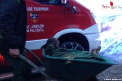 Die Kameraden der ersteintreffenden Wehr von St. Lorenzen konnten mit schwerem Atemschutz in die Grube einsteigen und das Kalb einige Meter vom Eingang entfernt erfassen. Gemeinsam mit den übrigen Helfern gelang es, das Kalb lebend aus der Grube zu retten. Nach einer Grobreinigung konnte das Jungtier mittels Schiebetruhe und auf Heu gebettet zu seiner Mutter in den Stall gebracht werden. Die Hilfe der beiden anderen Wehren wurde somit nicht mehr benötigt.