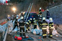 Die Feuerwehren St. Martin, Stein an der Enns und Gröbming begannen unterdessen mit der Menschenrettung der eingeklemmten Personen. Nachdem die verunfallten Fahrzeuge gegen abrutschen gesichert und mittels Motorsägen von Bäumen und Geäst befreit wurden, konnten die Rettungstrupps mit hydraulischem Rettungsgerät mit der Personenbefreiung starten. Parallel dazu wurden die eingeklemmten Insassen von Sanitätern stabilisiert und erstversorgt. Die FF Niederöblarn sperrte den Gefahrenbereich ab und dichtete den Gefahrgutbehälter unter schwerem Atemschutz ab. Der abgedichtete Behäter wurde – wie die Unfallwracks auch – vom WLF-K Gröbming geborgen und abtransportiert.