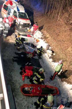 MITTERBERG (STMK): Am Samstag, den 21. Februar 2015, gegen 17 Uhr wurde die L712 im Bereich Strimitzen der Gemeinde Mitterberg-St. Martin von einer Lawine verschüttet. Zahlreiche Bäume wurden von den Schneemassen mitgerissen, insgesamt erfasste die Lawine einen Linienbus der ÖBB, drei Pkw und eine Fußgängergruppe – so lautete das Übungsszenario.