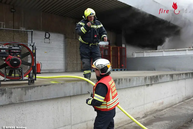 Schon bei der Anfahrt war eine große Rauchsäule sichtbar. Um 14:37 Uhr wurde die Alarmstufe auf "B4 Gewerbebetriebbrand groß" durch Einsatzleiter HBI Walter Wistermayer erhöht und die Freiwilligen Feuerwehren Mödling und Biedermannsdorf nachalarmiert.