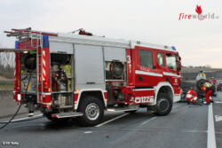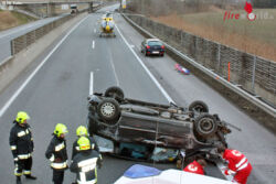 TULLN (NÖ): Am 26.02.2015 wurde die Feuerwehr Tulln um 07:18 Uhr zu einem Verkehrsunfall auf der Richtungsfahrbahn Krems der Stockerauer Schnellstraße alarmiert. Auf Höhe von Straßenkilometer 10.5 hatte sich ein mit vier Personen besetzter Lancia überschlagen und schlitterte in weiterer Folge ca. 100 Meter am Dach liegend über beide Fahrspuren.