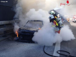 Einige hundert Meter hinter der Unfallstelle bemerkte eine im Stau stehende Automobilistin kurz nach 12 Uhr, dass die Motorenkontrolllampe ihres Mini aufleuchtete. Sie hatte den Pannenstreifen noch nicht erreicht, als bereits Rauch aus dem Motorraum drang. Die Frau verliess das Auto, worauf dieses in Kürze in Vollbrand stand. Noch bevor die Feuerwehr wenig später eintraf, brannte der Kleinwagen aus. Die genaue Brandursache ist noch unklar. Die Kantonspolizei hat ihre Ermittlungen aufgenommen.