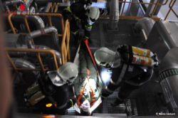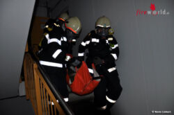 Die Verletzten wurden auf zwei Ebenen (7,5 und 15 Meter Höhe) aufgeteilt. Die Rettung der Verletzten erfolgte über drei Treppenhäuser, welche der Feuerwehr im Ernstfall als Flucht- und Angriffsweg dienen. Nach der Rettung wurden die Verletzten den Feuerwehrsanitätern übergeben, welche eine erste Einschätzung der Verletzung sowie die Erstbehandlung vornahmen. ABI Masser bedankte sich bei der Schlussbesprechung für die erbrachten Leistungen und die erfolgreiche Ausarbeitung.