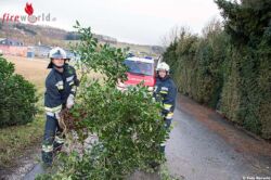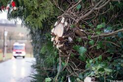 Vor Ort stellen stellten die Einsatzkräfte fest, dass ein Baum schräg über einen Gartenzaun auf eine Straße hing. Nachdem die Einsatzsteile abgesichert war,konnte aus dem Baum mittels Motorsäge rasch ‚Kleinholz‘ gemacht werden.
