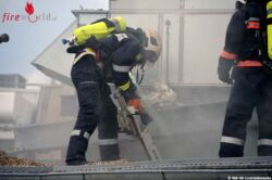 Daraufhin wurde unter Atemschutz an mehreren Stellen die Dachkonstruktion geöffnet und begonnen die zahlreichen Glutnester abzulöschen. Da sich diese Nachlöscharbeiten sehr aufwändig gestalten, befinden sich derzeit (19:00 Uhr) noch immer Einsatzkräfte vor Ort.