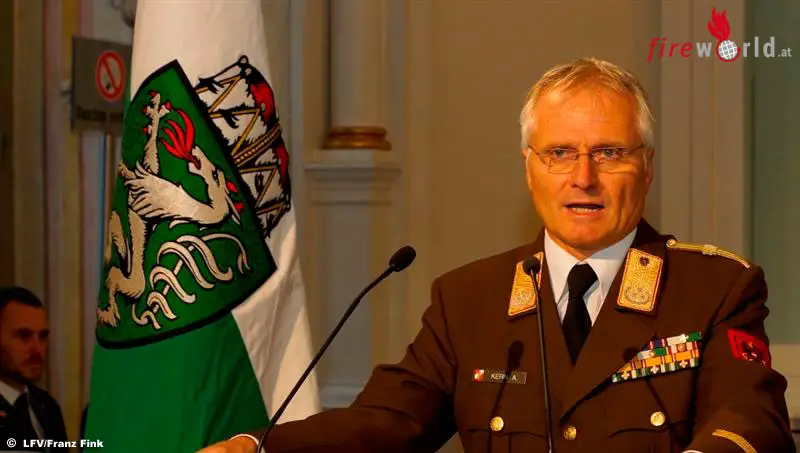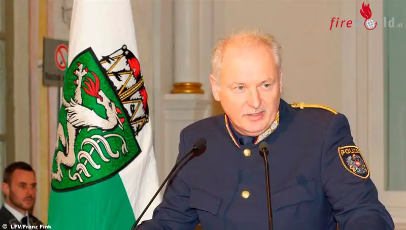 Laudator Landespolizeidirektor Hofrat Mag. Josef Klamminger hielt seinen Festvortrag zum Thema „Führungsverantwortung und Ehrenamt“ und ging in seinen Ausführungen auf Bereiche wie Ausbildung, Zusammenarbeit der Blaulichtorganisationen und künftige Bedrohungsszenarien ein.