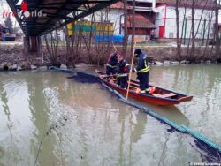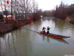Schnell ergoss sich das Öl in den Pramfluss und das umliegende Erdreich. Die Feuerwehr Andorf begann als Erstmaßnahme gleich einmal mit der Errichtung einer Ölsperre unterhalb der Unglücksstelle und im langsamer fließenden Rückstaubereich der Pram. Zeitgleich wurde das rundherum um den Bagger ausgeflossene Öl gebunden. Durch die rasche Einbringung der Sperren konnte das gesamte ausgetretene Hydrauliköl aufgefangen werden und somit verhindert werden, dass es zu einer massiven und großräumigen Verschmutzung kommen konnte. An insgesamt vier Stellen musste eine jeweils 25 Meter lange Ölsperre über die Pram gelegt werden um die Gefahr zu bannen. In weiterer Folge wasserten wir unsere beiden Zillen, um von diesen aus das aufgebrachte Ölbindemittel abzuschöpfen. Bis weit in den Nachmittag hinein waren wir mit den Arbeiten auf dem Pramfluss beschäftigt.