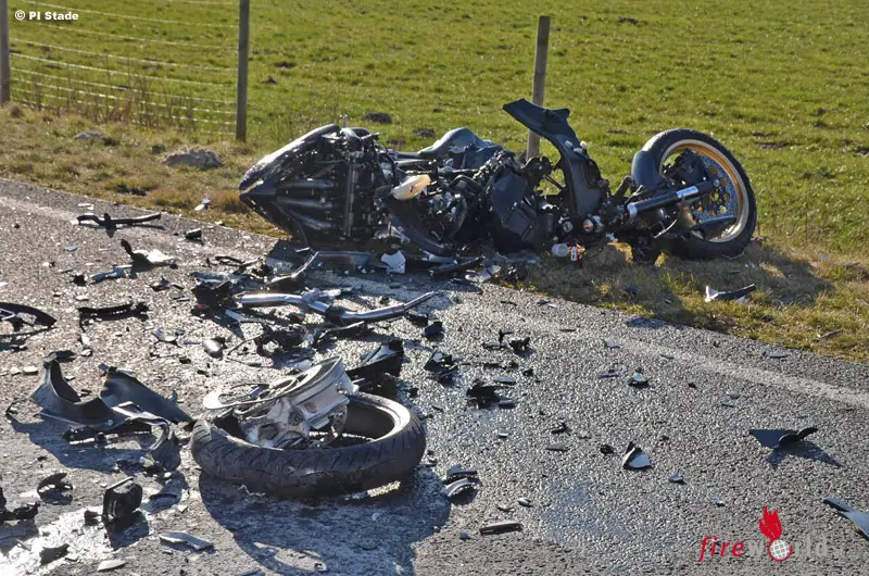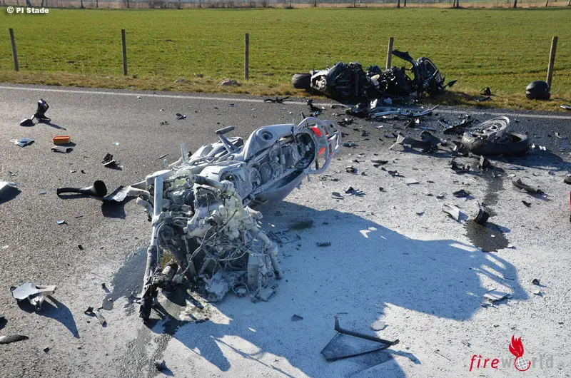 Durch die Wucht des Aufpralls wurden beide Motorräder total zerstört, die BMW geriet dabei noch in Brand, konnte aber durch die ca. 20 angerückten Feuerwehrleute des 2. Zuges der Ortswehr Stade schnell gelöscht werden.