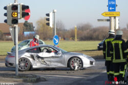 AUGSBURG (BAYERN): Kurz vor 8:30 Uhr wurde die Berufsfeuerwehr Augsburg am 9. März 2015 zu einem Verkehrsunfall gerufen. An der Kreuzung Gersthofer Straße/ Mühlhauser Straße kam es zu einem Verkehrsunfall zwischen einem Porsche und einem BMW.