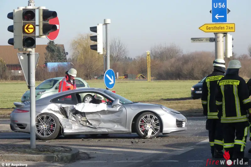 AUGSBURG (BAYERN): Kurz vor 8:30 Uhr wurde die Berufsfeuerwehr Augsburg am 9. März 2015 zu einem Verkehrsunfall gerufen. An der Kreuzung Gersthofer Straße/ Mühlhauser Straße kam es zu einem Verkehrsunfall zwischen einem Porsche und einem BMW.