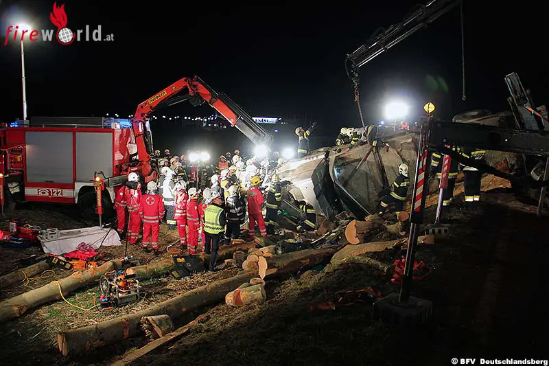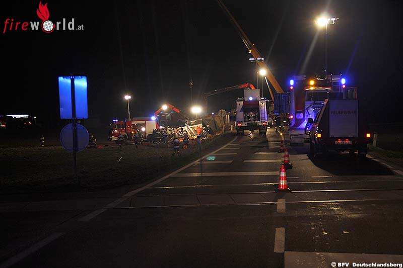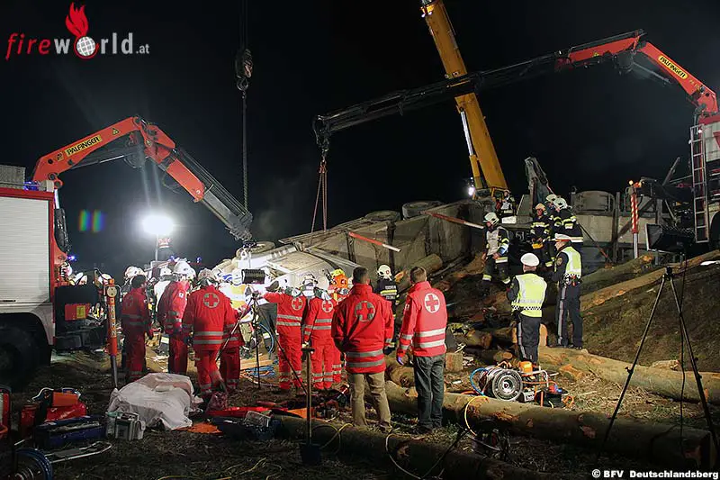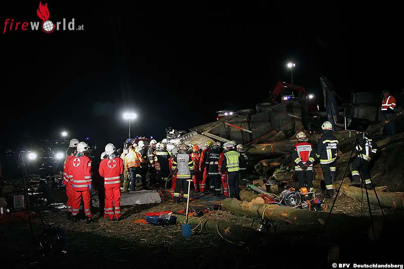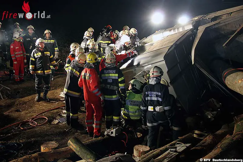 Aufgrund des Unfallausmaßes wurden kurz darauf bereits die Freiwilligen Feuerwehren Deutschlandsberg und Wies ebenfalls nachalarmiert. Am Einsatzort bot sich ein Bild der Verwüstung, die Holzblöche waren über die Fahrbahn verteilt, der Lkw lag seitlich, teilweise im Acker, ebenso waren die beiden Pkw massiv beschädigt worden. Die Pkw-Lenker konnten sich selbst befreien und wurden vom Roten Kreuz erstversorgt und ins Krankenhaus gebracht. Schwieriger gestaltete sich die Rettung des Lkw-Fahrers.