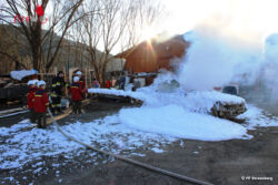 Als das Fahrzeug schließlich in Vollbrand stand, wurde vom Angriffstruppführer "Wasser Marsch" befohlen. Durch Handzeichen zwischen Angriffstruppführer und Maschinisten wurde dann der Wasserdruck auf 2,5 bar geregelt um das Herstellen von Schaum zu ermöglichen. Danach wurde Befehl "Schaum Marsch" gegeben und das Schaummittel mittels Zumischer in die Löschleitung zugeführt. Als sich dann ein Schaumteppich entwickelte, wurde mit der Brandbekämpfung begonnen und das Fahrzeug komplett mit Schaum zugedeckt, um ein Ersticken der Flammen zu bezwecken. Nach kürzester Zeit konnten wir wieder "Brand aus" geben und wieder ins Rüsthaus einrücken.