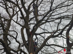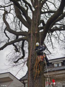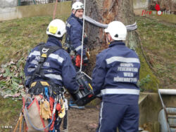 Sie gab an, dass die Katze den Baum nicht mehr selbstständig verlassen können wird. Da der Baum nicht mit einer Drehleiter angefahren werden konnte, ersuchte die FF Kierling die Wiener Berufsfeuerwehr um Unterstützung. Von Mitarbeitern der Höhenrettung wurden mittels „Seilschleuder“ zwei Seile am Baum aufgezogen, um anschließend mit einer Akku-Seilwinde und danach mit Baumsteigeisen zur Katze zu gelangen. Bevor sich die Höhenretter wieder abseilten durfte die Katze im Transportsack als erste wieder zu Boden, um der glücklichen Besitzerin übergeben zu werden.
