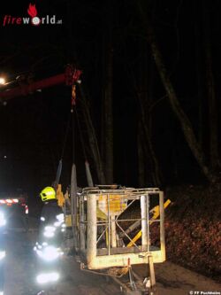 Ein Fahrer eines Pkws hatte aus bisher unbekannter Ursache seine Arbeitsbühne verloren. Diese stürzte um und blockierte den Ahberg. Unter Einsatz des Ladekrans des Wechselladefahrzeuges und der Einbauseilwinde des Rüstlöschfahrzeuges wurde die Arbeitsbühne wieder auf die Räder gestellt.