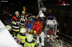 Der Mann verletzte sich so schwer am Knie, dass er vom Notarztteam „Bogenhausen“ und einer RTW Besatzung des BRK versorgt werden musste. Da die Baustelle nahezu im Rohbauzustand war und der Patient nicht über Leitern gerettet werden konnte, wurde die Hubrettungsbühne nachgefordert. Der Mann musste dazu erst durch die Baustelle getragen und eine Etage tiefer verbracht werden. Dazu wurde der Patient in eine Schleifkorbtrage gelegt. An der Fassadenseite wurde nun die Hubrettungsbühne aufgestellt. Über den Korb der Bühne konnte der Patient auf eine Trage umgelagert werden.