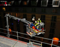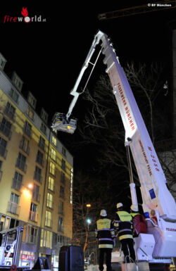 MÜNCHEN (BAYERN): Eine aufwendige Rettungsaktion beschäftigte am Abend des 18. März 2015 die Einsatzkräfte in München. Ein Bauarbeiter verletzte sich auf einer Baustelle und musste mit der Hubrettungsbühne aus 25 Metern Höhe gerettet werden.