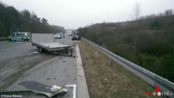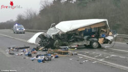 Insgesamt drei Fahrzeuge, darunter ein Pkw und zwei Kleintransporter, waren auf dem Autobahnzubringer verunglückt. Die Einsatzstelle glich einem Trümmerfeld, da sich Fahrzeugteile auf einer Fläche von ca. 200 Metern verteilten. Eine Person wurde bereits durch Ersthelfer aus dem Fahrzeug befreit und mit Erste-Hilfe-Maßnahmen versorgt. Die anschließend durchgeführten rettungsdienst- und notärztlichen Maßnahmen mussten allerdings erfolglos abgebrochen werden, die Person verstarb noch an der Unfallstelle.